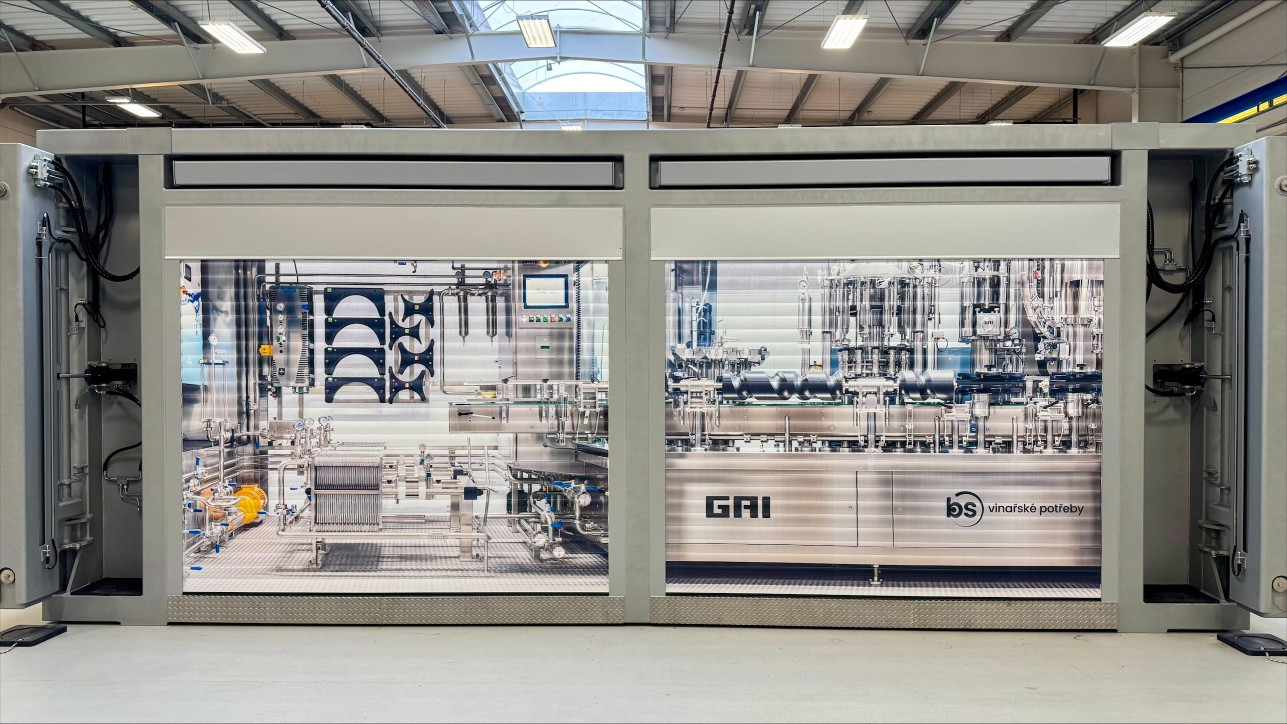 Pojízdná stáčírna vína, kterou firma UNiMARCO umístila na pojízdný kontejner, se ze stran a zezadu uzavírá kovovými garážovými lamelovými vraty, na která jsme natiskli fotky otevřeného kontejneru. Takže i při zavřených vratech je vidět, jak to vypadá uvnitř.